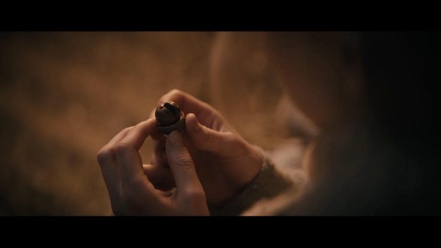 看來本片這 Askepott 雖然生活處境還算健康沒被禁錮凌虐,但後母長年貶損 negging多少養成了她自我懷疑。也許聖誕雪夜是要有些天降大禮打開她心扉?在此沒有神仙教母只有一隻貓頭鷹睜大了雙眼,相較於 1973 版那隻真貓頭鷹怎麼演出人類就怎麼拍攝,這 2021 版新貓頭鷹必有特效輔助擠眉弄眼處處是隱晦提點!大叔進城該給 Askepott 帶什麼禮物?她安分知足「你第一個撿到的什麼都好」禮輕情意重。誰知陰錯陽差王子胡鬧竟給大叔遇上天上掉下的「三顆榛果」?Askepott兀自不解,卻見貓頭鷹定睛凝視若有深意這必有天降機緣!只是機緣來了她又該怎麼把握?