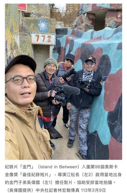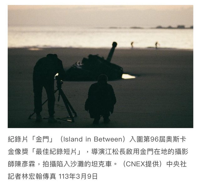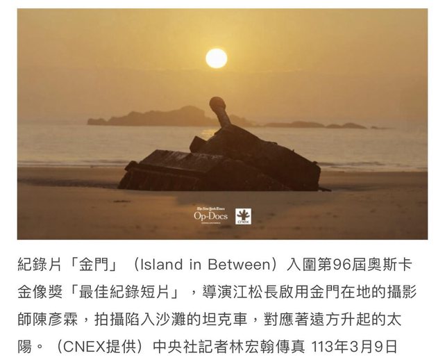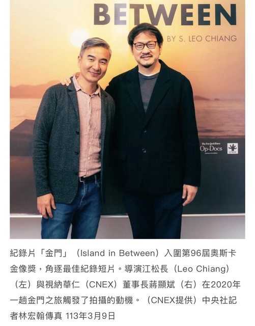 片長約20分鐘的「金門」(Island in Between)入圍第96屆奧斯卡金像獎「最佳紀錄短