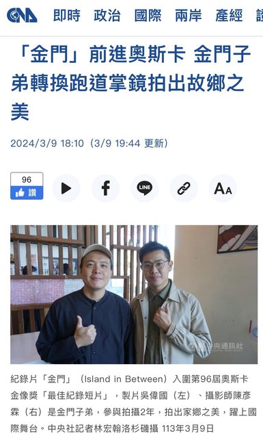 標題[新聞] 金門前進奧斯卡 當地子弟轉換跑道掌鏡
