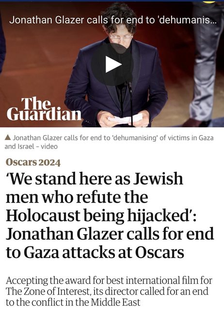 Glazer calls for end to Gaza attacks at Oscars