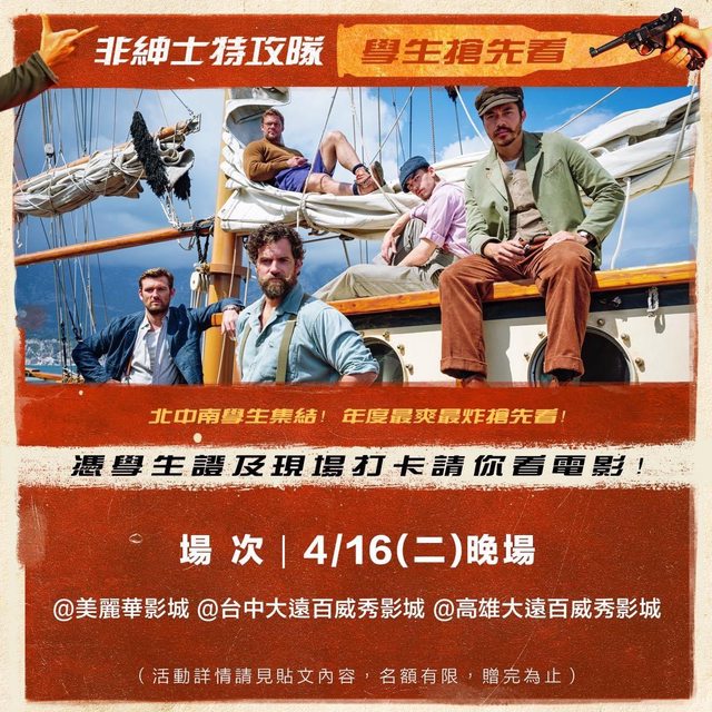 事先報名並攜帶本人學生證正本(或在學證明)並完成現場打卡,就有機會搶先全台看【非紳士特攻隊】!
