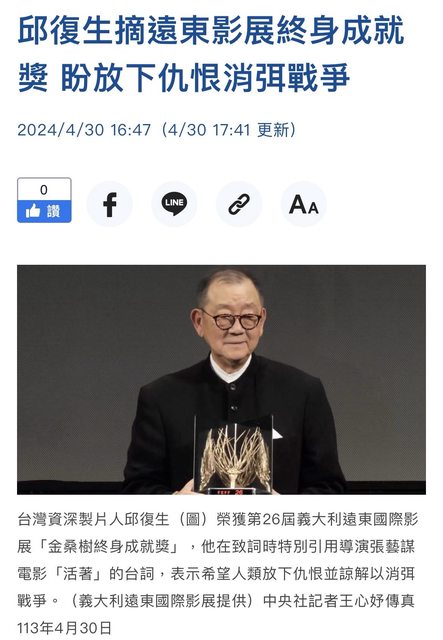 標題[新聞] 邱復生摘遠東影展終身成就獎