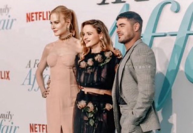 妮可基嫚(左起)、柴克艾福隆、喬伊金(左)在首映活動上七嘴八舌。(Netflix提供