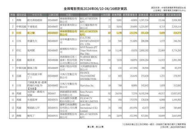 全國電影票房2024年06/10-06/16統計資訊