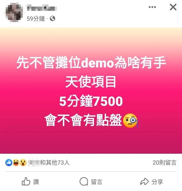 有網友不解,CU角色扮演宇宙活動現場為何會有手天使項目,還標榜5分鐘7,500元,質疑
