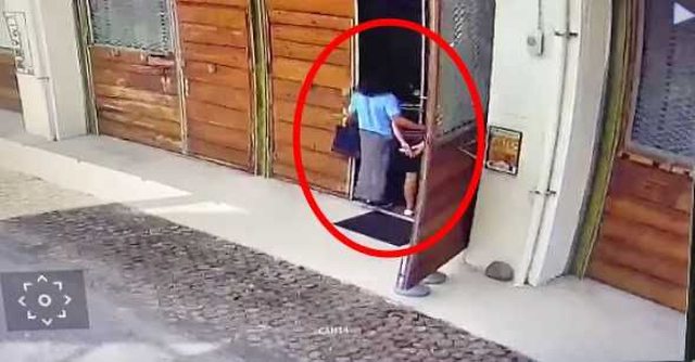 ▲從監視器畫面中可以看見,林世偉(左)的手試圖摟向展場工讀生。