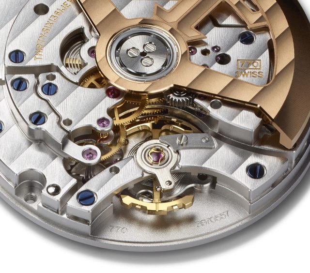 積家這隻770機芯透過額外設置的五齒星形輪及緩衝游絲達到跳秒效果,並且特別採用Gyr