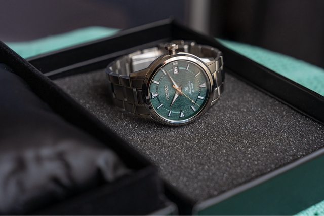 物品說明:旗艦店限定款精工登山者,猶如草地質感般的錶面,玫瑰金秒針與綠面盤相映
