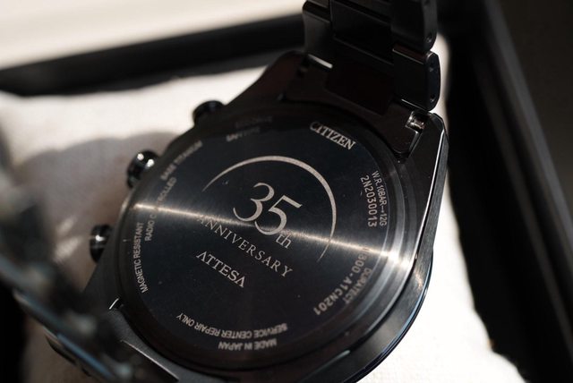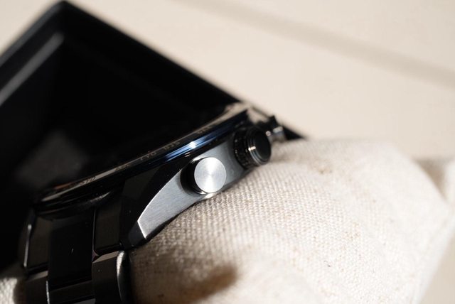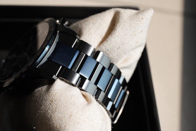 不同於以往不鏽鋼錶殼,鈦金屬除了有髮絲紋,重量也是少了很多