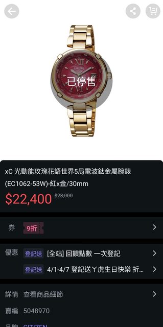 池)!有多餘錶帶,太太配戴16cm,多3節可以到18cm,原價28,000元,網路22400元(8折