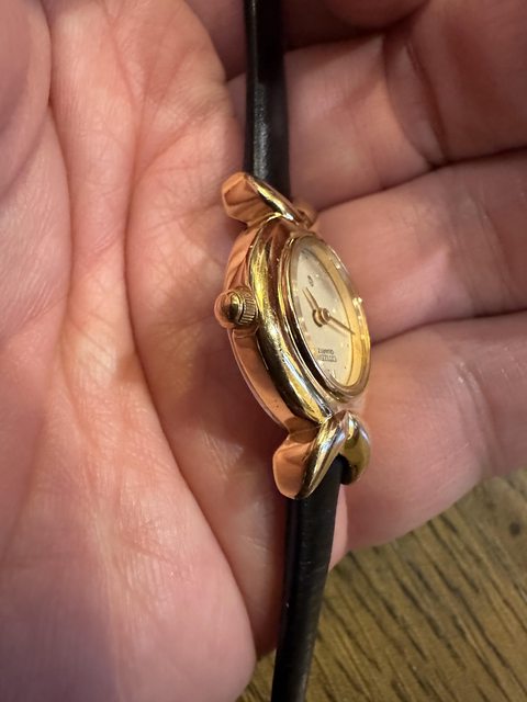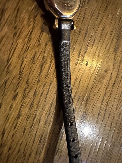 圓形金色錶殼很有特色。黑色皮革錶帶。目前找不到到另一款與這款完全相同的原裝古董Ci