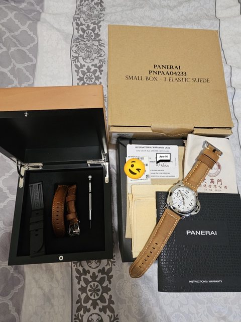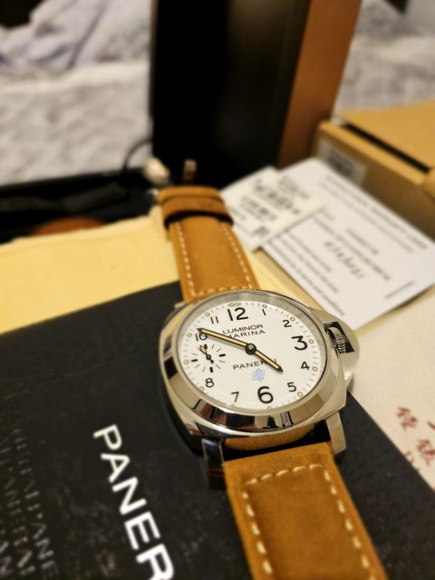 沛納海入門款,手上鍊,有經典護橋及小秒針設計,白面盤搭各種顏色錶帶都適合,整體