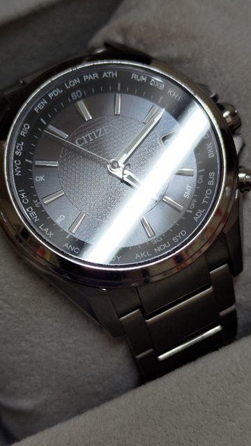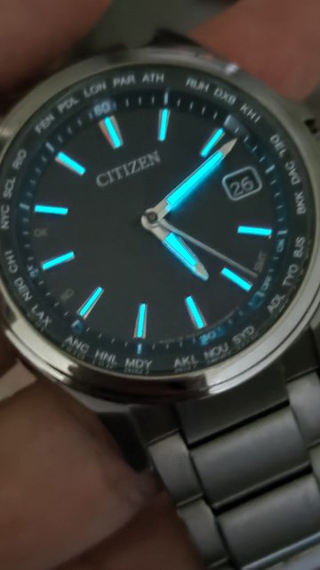 的大三針判讀容易,時標跟指針晚上都有夜光,藍寶石鏡面無傷,5局電波對時正常,萬